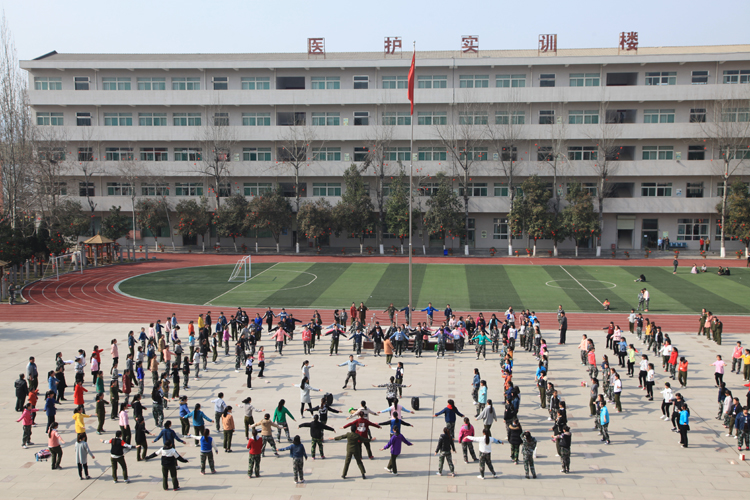 每天上午10时,微风徐徐,阳光明媚,随着《向快乐出发》广播操音乐响起,学生、教职工纷纷走出教室和办公室,走进阳光,齐聚南丁格尔广场。此次活动得到了学校领导的高度重视,学校领导张玉顺、李兰、李都都、牛波等也加入到广播操队伍中,认真学习每一节的动作。大家精神饱满,每一次举手、抬脚、弯腰、转身、跳跃等动作都协调有力,舒展优美。