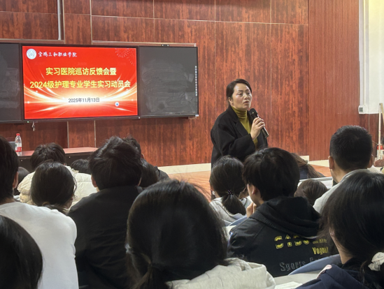 2025年11月13日下午16:30,招就处与医护学院在学术报告厅一楼联合召开2024级护理专业实习动员大会。24级全体护理学生、25级护理班干及医护学院全体教师参会。