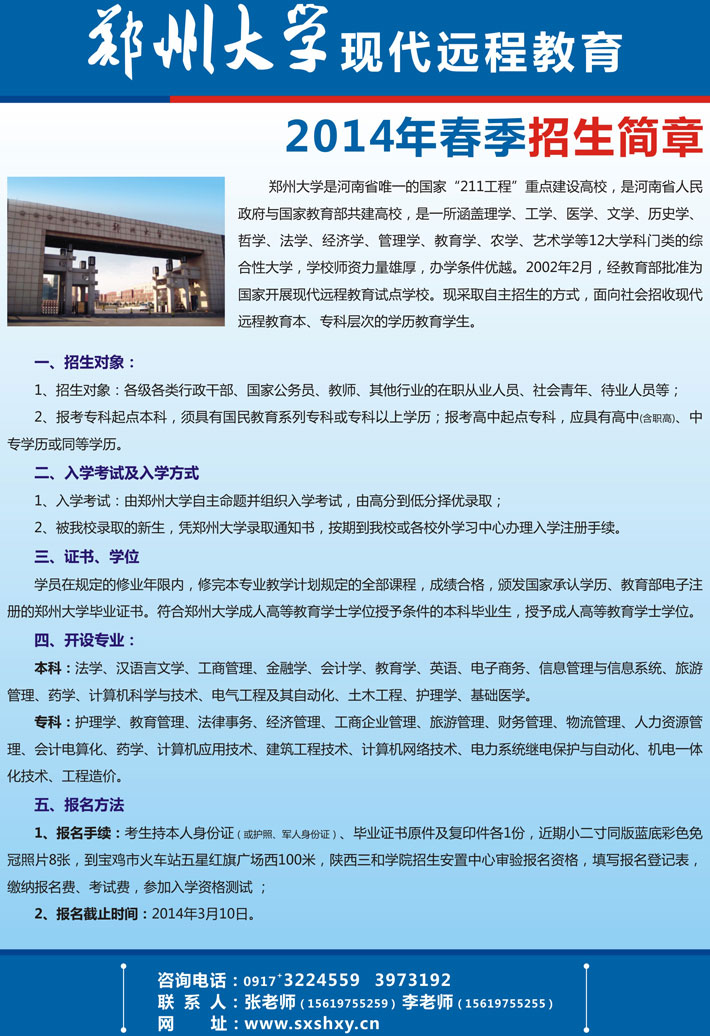 郑州大学现代远程教育2014年春季招生简章