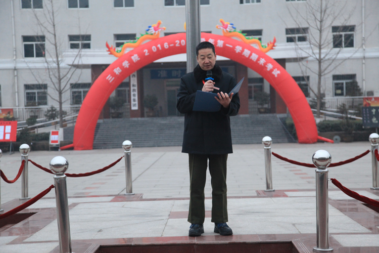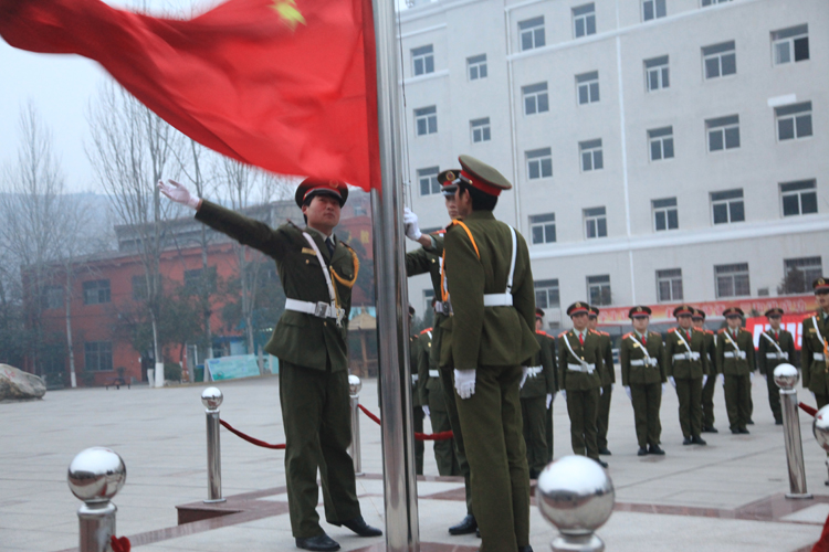 早上8时整,国旗护卫队员精神抖擞地迈着正步,3名国旗手护卫着五星红旗步伐铿锵来到国旗台下。在庄严的国歌声中,鲜艳的五星红旗冉冉升起,全体师生行注目礼。在升旗仪式上,副院长张玉顺为全校师生致新年贺词。他首先回顾了过去的一年里学校师生取得的优异成绩,然后对全校师生提出了新要求,他希望全体教职工在新的一年里加强学习、为人师表、牢记使命,教书育人,无愧人民教师这一光荣称号。希望全体学生志存高远、努力学习,养成好习惯、培养好性格,做一个身心健康,乐观向上、品学兼优的学生。