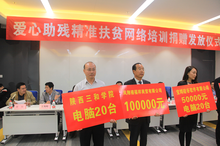 2017年9月5日,宝鸡市残疾人福利基金会、宝鸡市残联在渭滨区互联网产业园举行爱心助残精准扶贫网络培训捐赠发放仪式,50名残疾人网络培训后获赠电脑。学校向贫困残疾人捐赠电脑20台。