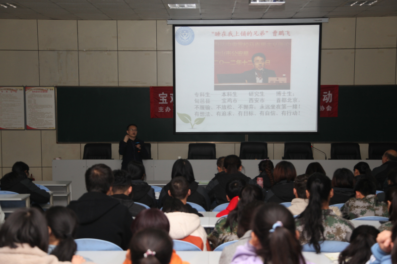 本次活动由宝鸡教育学院教师赵广才老师主讲,他从自己人生经历展开话题,总结出人生九字箴言“有梦想,内心正,努力干”。接着,又从学习,反思,实践几个方面来进行举例,他勉励学生:一·珍惜时光,发奋读书;二·积极阳光,铸就品德;三·健身健心,逐梦前行。
