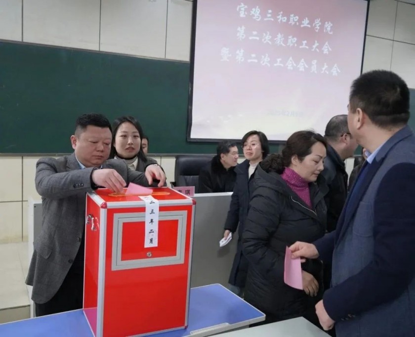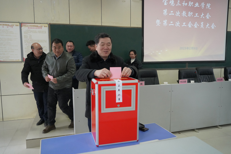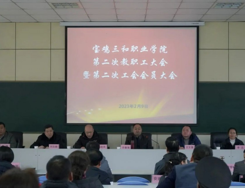 2月9日下午,宝鸡三和职业学院在一号演讲厅召开第二次教职工大会暨第二次工会会员大会。理事长许春海、院长王文强,副院长刘志毅、李兰、李琪,院长助理郑鹏出席,会议由党支部书记杨宏民主持。