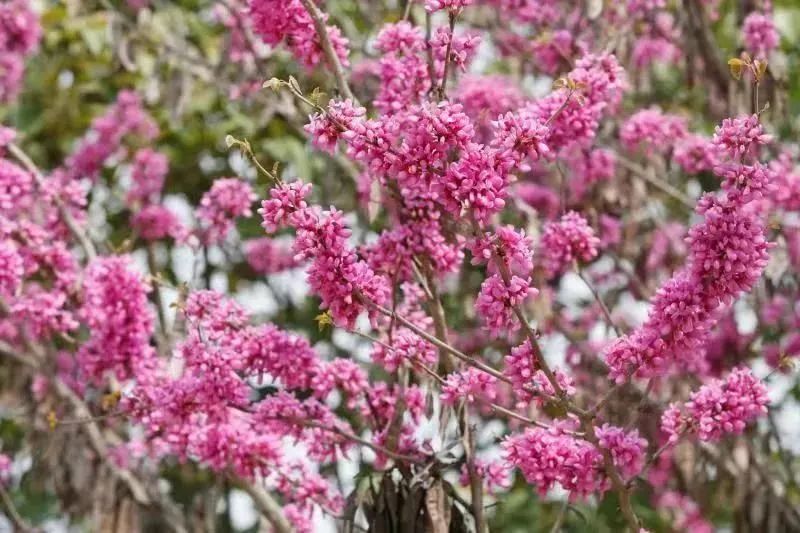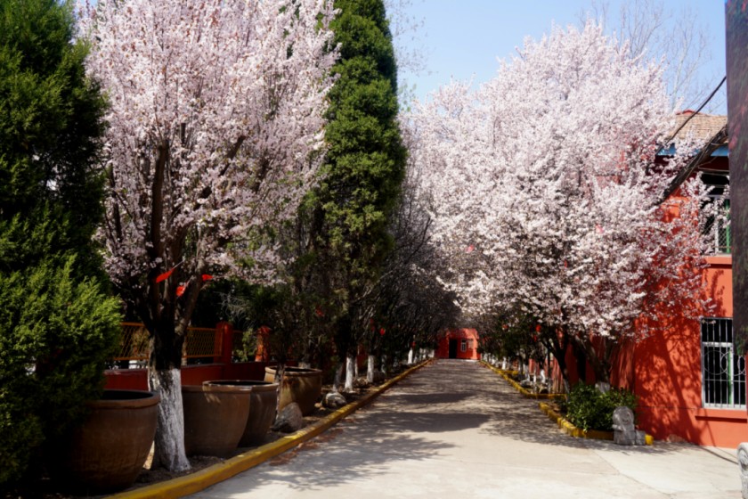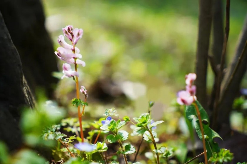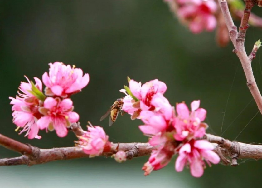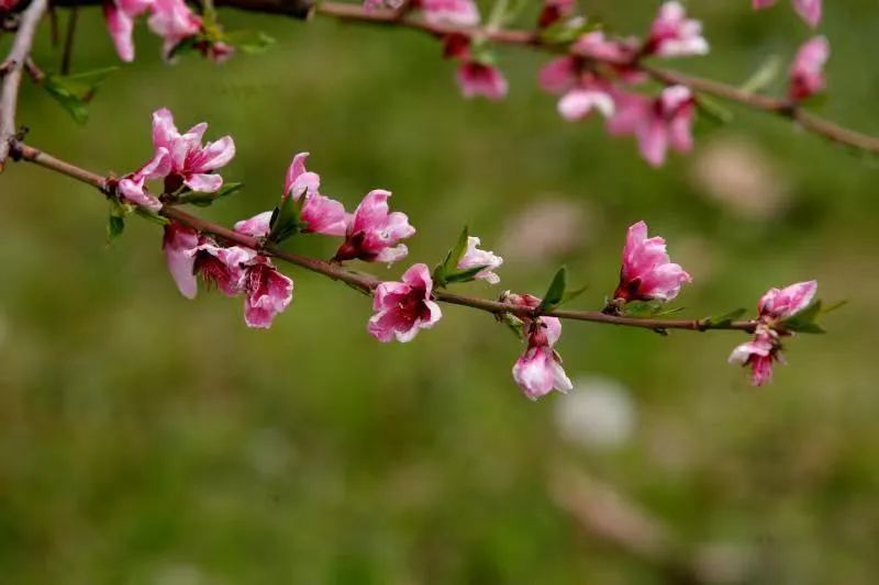 如火般绚烂的成群结队的红叶李、嫩黄的蒲公英、朝霞般的桃花……