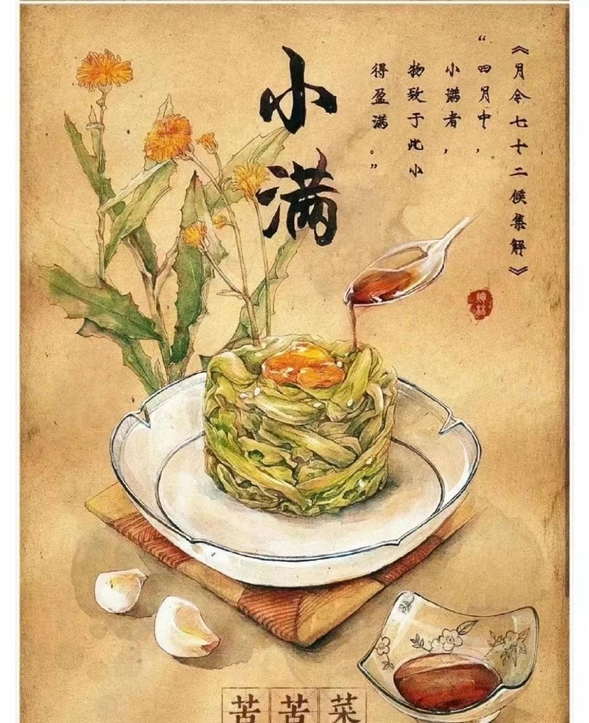 食野菜也是小满的风俗之一。苦菜是中国人最早食用的野菜之一。旧时民间有吃野菜、苦菜的习俗,可以清热去火。春风吹,苦菜长,荒滩野地是粮仓。医学上多用苦苦菜来治疗热症,古人还用它醒酒。